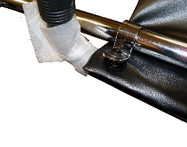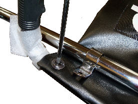 5. Align the sliding bracket on the IV pole with the top hole of the back upholstery and install the screw through the bracket and upholstery.